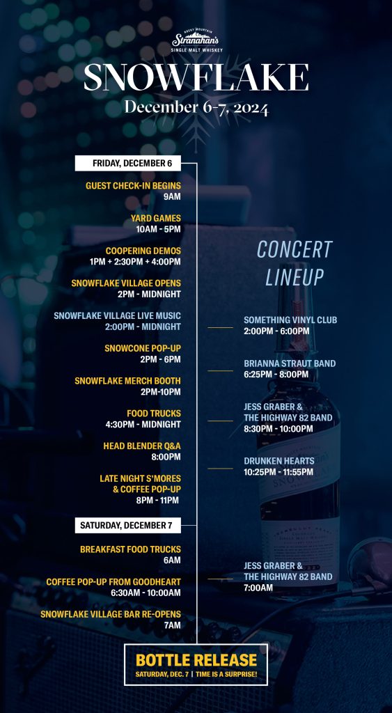 The most legendary release in whiskey is back! Snowflake Batch #27 will officially go on-sale exclusively at the Stranahan’s distillery on Saturday, December 7 with Snowflake Village kicking off on Friday, December 6.